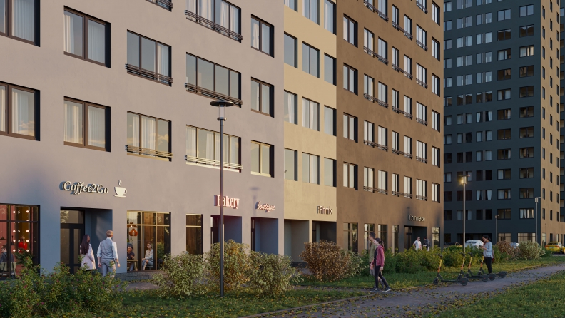 Все помещения расположены на первом этаже вдоль проходимых улиц. Рядом со второй очередью будет расположен пешеходный парк‐бульвар и детский сад.