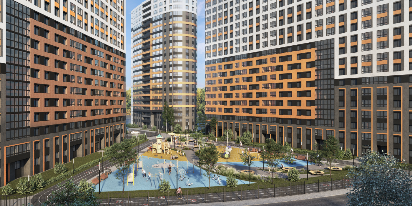 Четыре разновысотных дома с детскими и спортивными площадками, уютными зонами для отдыха и пешеходными променадами во дворе